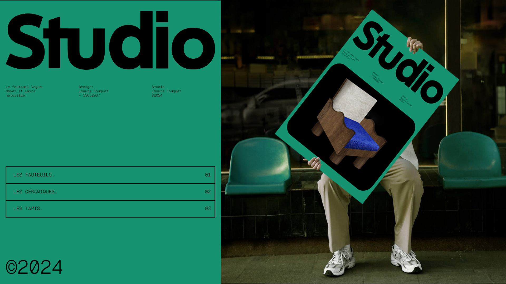 J’ai imaginé une collection de fauteuil et objets, inclue dans un concept qui s’appelle studio. Ce studio regroupe plusieurs de mes objets. Création de logo ici et d’identité graphique.